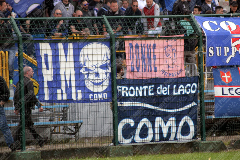 L’intervallo serve ai più per abbeverarsi ma c’è anche chi ricomincia a cantare prima che i ventidue rimettano piede in campo. Pronti, via e di nuovo riparte il sostegno lariano, affatto scalfito dalle fatiche del primo tempo. Si susseguono i cori di incitamento ma c’è anche modo, come già successo in precedenza, di ricordare vecchie e nuove inimicizie: il pensiero, poco affettuoso naturalmente, è rivolto in pari misura al Varese ed anche al Piacenza, tifoseria quest’ultima che sarà probabilmente diretta avversaria nel primo turno dei play-off e con la quale c’è qualche conto in sospeso da sistemare. Tra i comaschi sono presenti anche esponenti degli Eagles Cantù, per i quali vengono intonati cori di saluto e cori anti-Milano, acerrima avversaria sui campi di parquet.