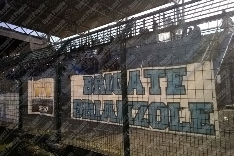 I sostenitori lariani riempiono senza fretta la tribunetta coperta che è posizionata alla sinistra di quella centrale e trasformano la recinzione in un muro di stendardi, bandiere e piccoli striscioni. “Como Supporters”, “Banda Como” e “Pesi Massimi” sono le realtà forse note ai più, ma non mancano altre pezze, talune esteticamente davvero pregevoli, a marcare la presenza di questo o quel gruppetto. Altrettanto bello a vedersi il bandierone a sfondo bianco che sventola con regolarità e… un po’ di fatica visti gli spazi stretti del settore ospiti.